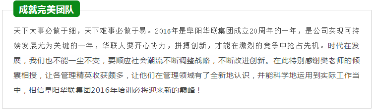 阜陽(yáng)華聯(lián)集團深諳團隊的力量,誓言將團隊建設進(jìn)行到底!本次管理培訓是公司2016年度第一場(chǎng)管理層全方面進(jìn)階培訓,足以證明公司對培訓的重視程度!